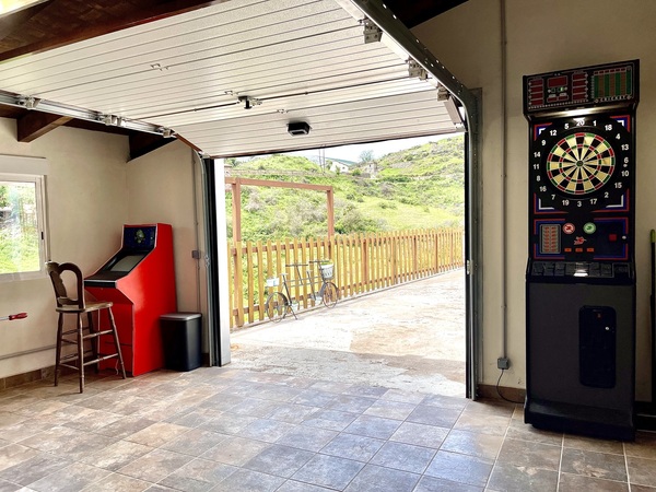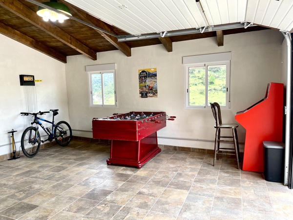 Como complemento, la casa cuenta con una zona de juegos cubierta, equipada con futbolín, dardos y el clásico juego de la rana, ideal tanto para adultos como para niños.